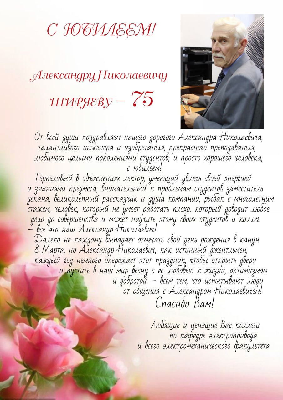 От всей души поздравляем Александра Николаевича, талантливого инженера и изобретателя, преподавателя, и просто хорошего человека, с юбилеем!