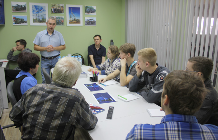 Заместитель директора КБПР по серийным кранам Артем Андреев познакомил студентов с масштабом работ, проводимых сотрудниками конструкторского бюро, количеством выпускаемой техники, ряды которой составляют не только автокраны, но и краны-манипуляторы, автогидроподъемники, сваебойные и бурильные установки.