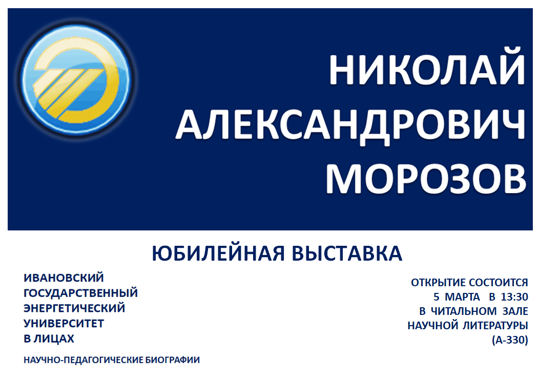 5 марта в 13:30 в читальном зале научной литературы (А-330) состоится торжественное открытие юбилейной выставки научных публикаций доцента по кафедре «Электромеханика»: ИГЭУ в ЛИЦАХ: Николай Александрович Морозов