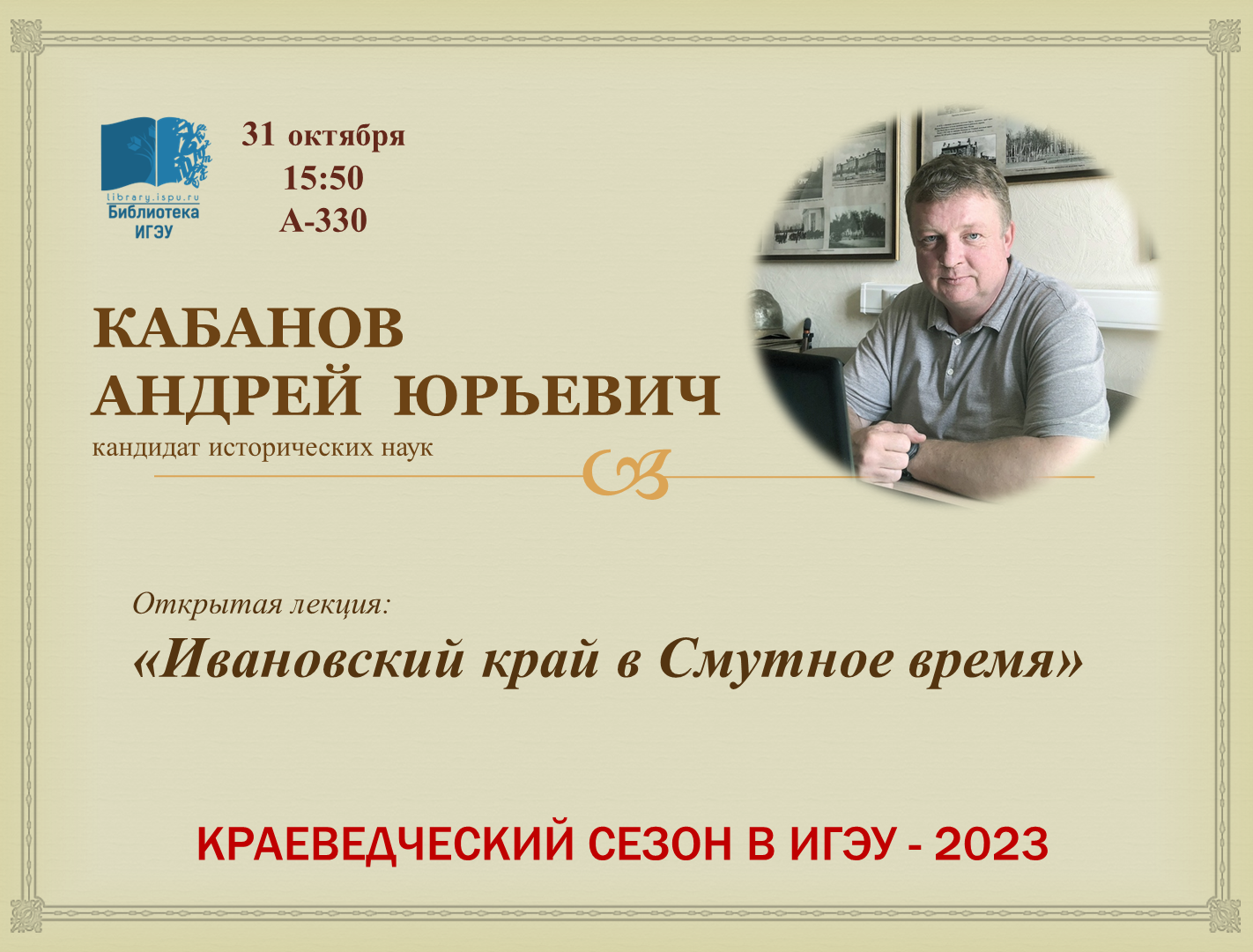 31 октября в 15:50 в читальном зале научной литературы библиотеки (А-330) при поддержке студенческого проекта «Живая книга» и в продолжение лектория «Краеведческий сезон в ИГЭУ - 2023» состоится встреча со специалистом по истории Смутного времени и последующего периода восстановления Российской государственности, кандидатом исторических наук Андреем Юрьевичем Кабановым.