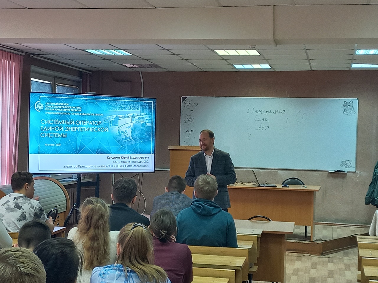 25 марта 2025 г. Директор представительства АО «СО ЕЭС» в Ивановской области Юрий Кандалов провел встречу со студентами 4 курса бакалавриата ИГЭУ, на которой поговорил с будущими молодыми специалистами о важных аспектах успешной работы в отрасли.