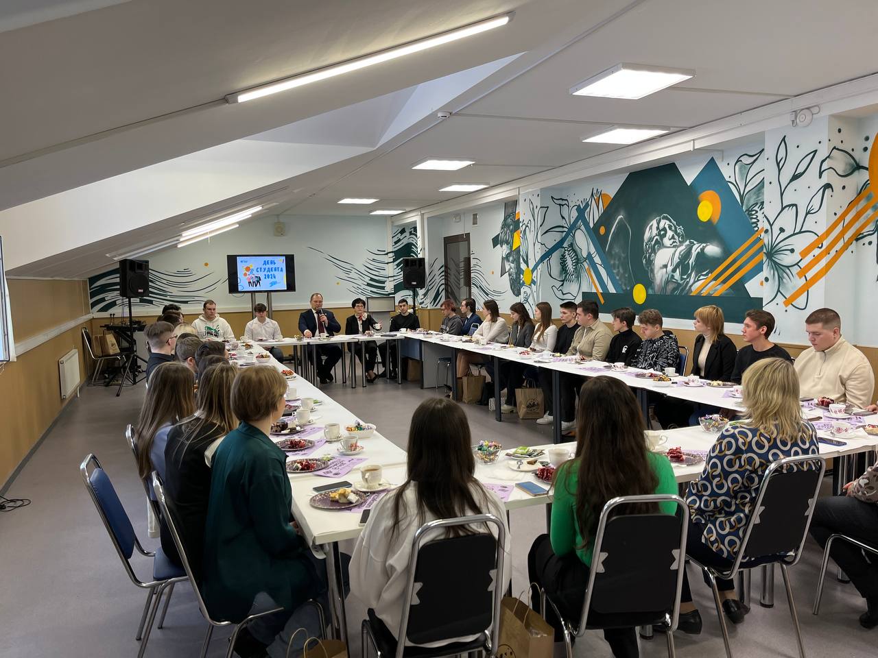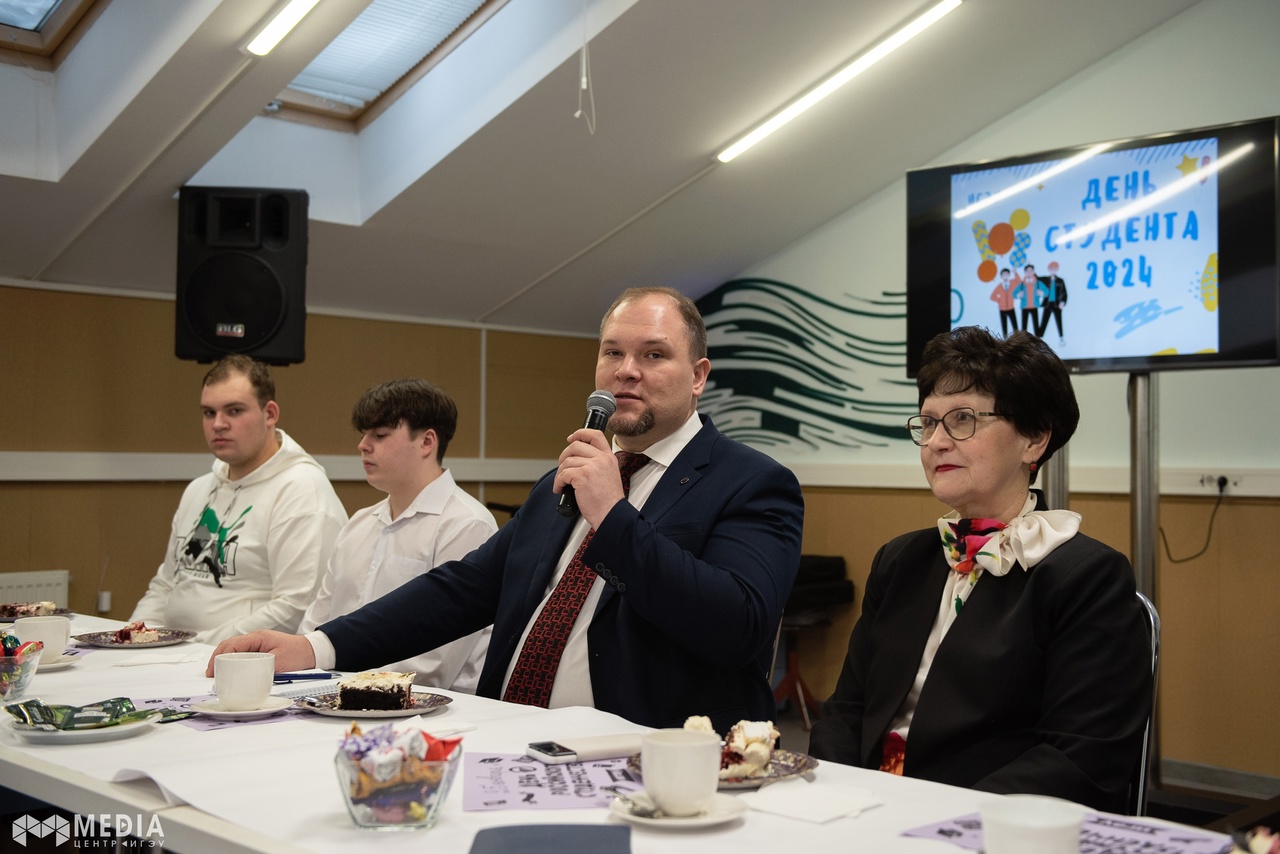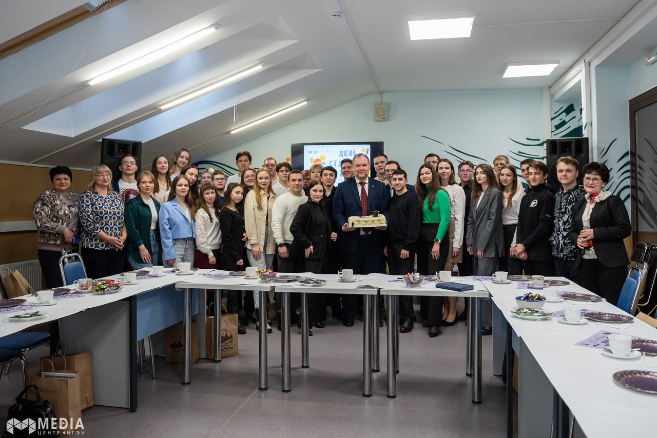 Григорий Васильевич поздравил студентов с праздником, поблагодарил их за работу в 2023 году, за активную позицию, за интересные проекты и рассказал, где могли бы применить свой талант и силы студенты, чтобы университет стал еще лучше. А в качестве подарка преподнес ребятам вкуснейший тематический торт.