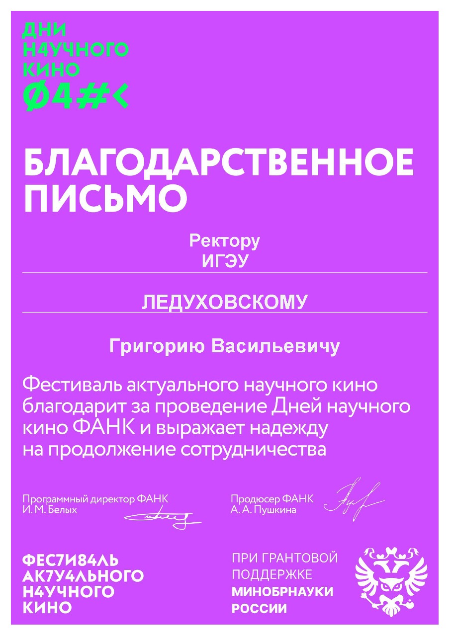 В Ивановском государственном энергетическом университете с 8 по 17 октября 2024 г. проходил показ документальных фильмов ежегодного Фестиваля актуального научного кино, проводимого ежегодно по инициативе Министерства науки и высшего образования РФ. Были просмотрены 5 фильмов: «Колбаса Митрофана Аксенова» «В ожидании волн и частиц», «Сквозь темную материю», «Фабрика заблуждения», «Озеро Восток. Хребет Безумия», посвященные особенностям и сложностям научного познания окружающего мира.
