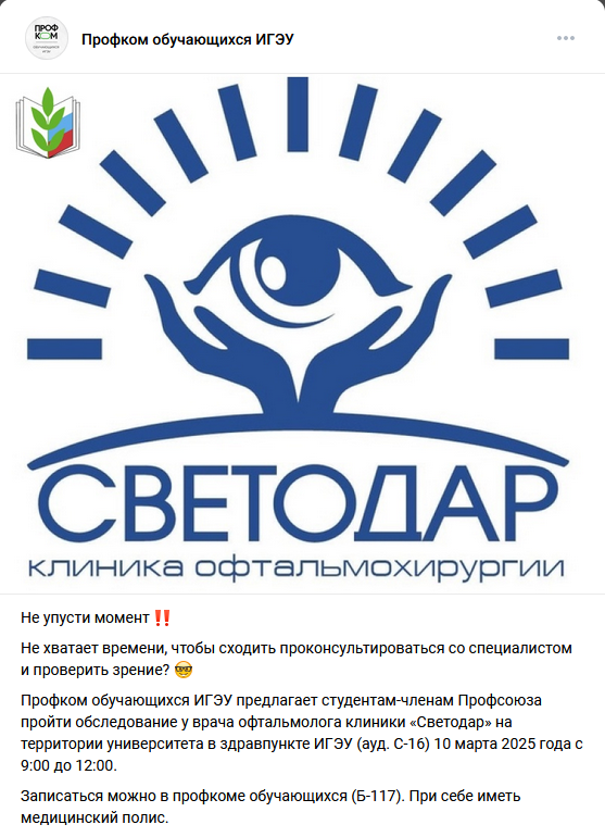 Студенты-члены Профсоюза имеют возможность пройти бесплатное обследование у врача-офтальмолога из клиники «Светодар» прямо в университете!
