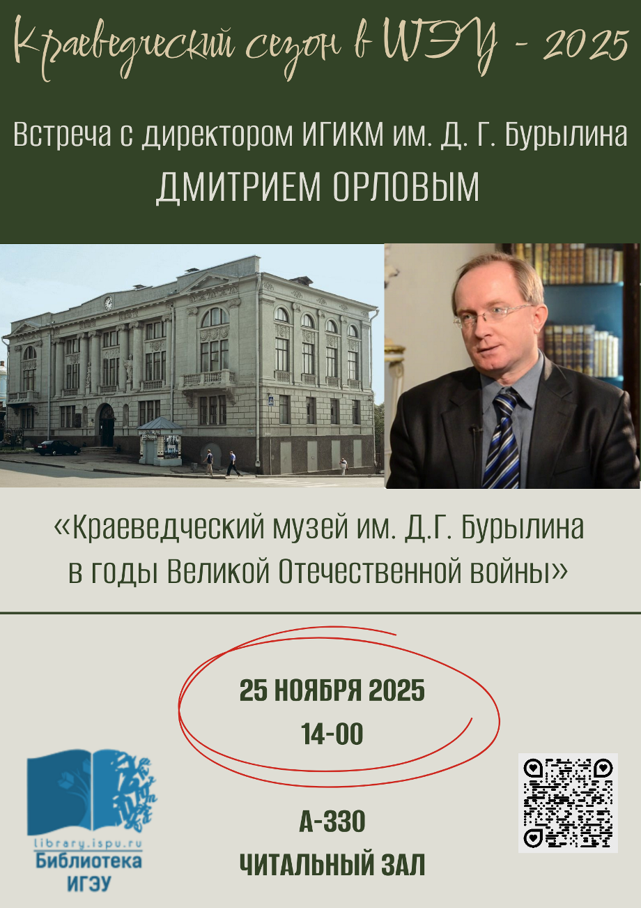 25 ноября в 14:00 в читальном зале научной литературы (А-330) состоится открытая лекция на тему «Краеведческий музей им. Д.Г. Бурылина в годы Великой Отечественной войны».