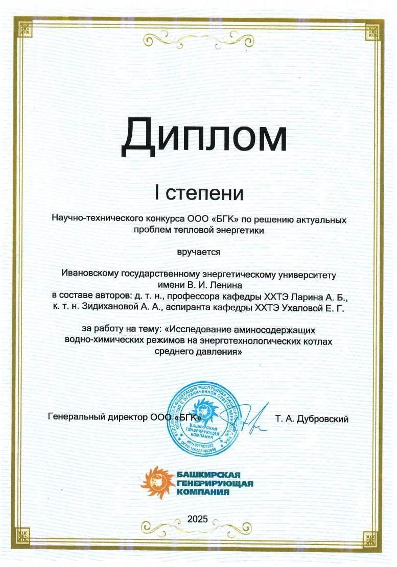 Башкирская генерирующая компания (БГК) регулярно проводит научно-технические конкурсы среди молодежи РФ по проблемам энергетики. В конкурсе 2025 года ИГЭУ участвовал с работой «Исследование аминосодержащих водно-химических режимов на энерготехнологических котлах среднего давления», выполненной молодыми учеными: Зидихановой А.А. и Ухаловой Е.Г. под руководством д.т.н. профессора Ларина А.Б.