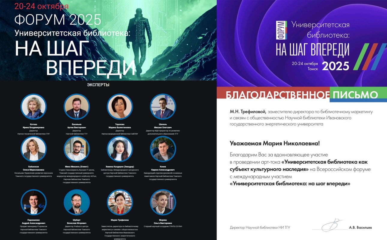 Библиотека ИГЭУ принимала участие в треке «Наследие»: кейс на тему «Университетская библиотека как субъект культурного наследия» в онлайн-формате представляла заместитель директора библиотеки Мария Трефилова. По итогам мероприятия в адрес Библиотеки и докладчика поступило благодарственное письмо директора научной библиотеки НИ ТГУ А.В. Васильева.