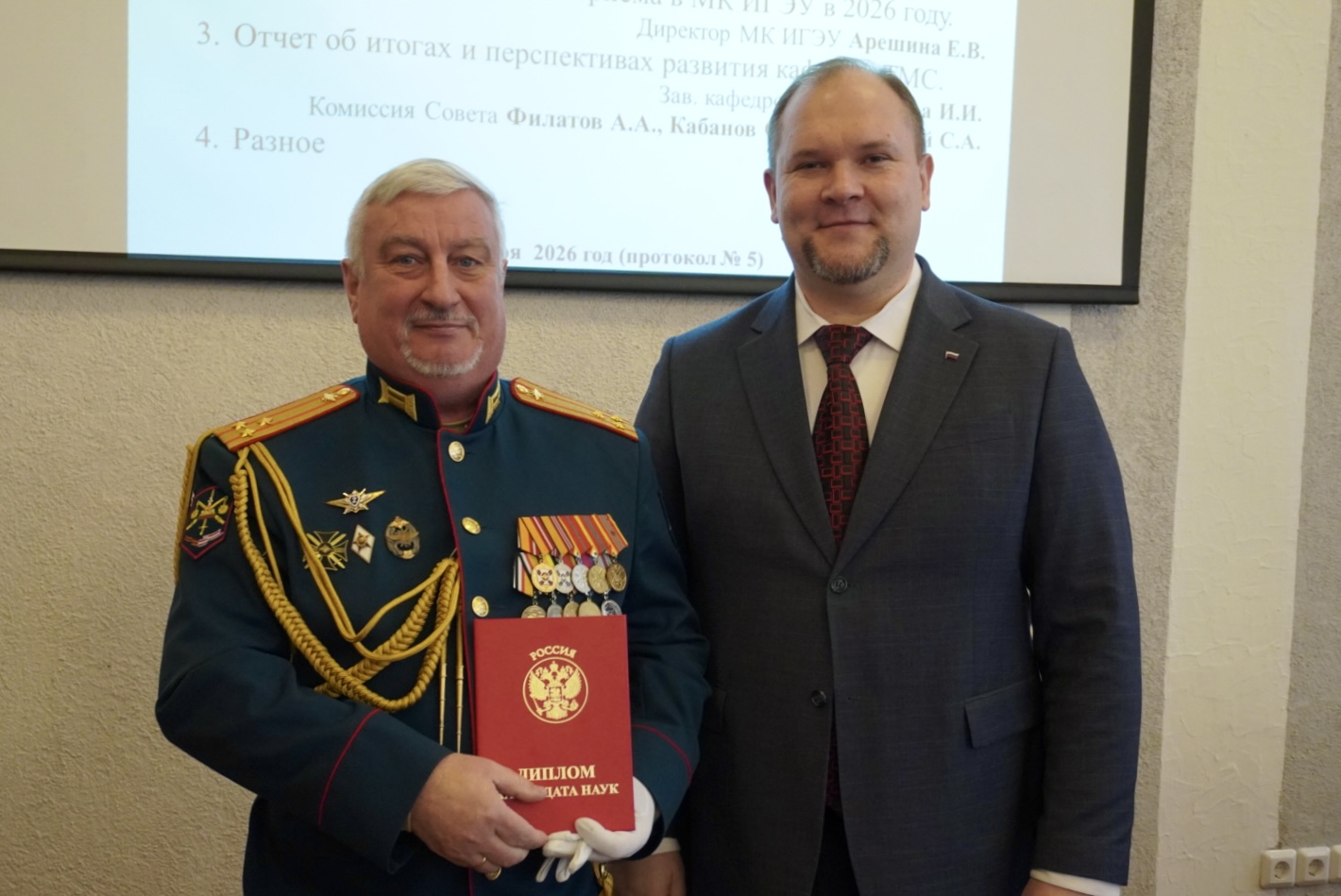 - Диплом кандидата педагогических наук – полковнику Кокошенко Виталию Степановичу, начальнику учебной части - заместителю начальника военного учебного центра ИГЭУ.