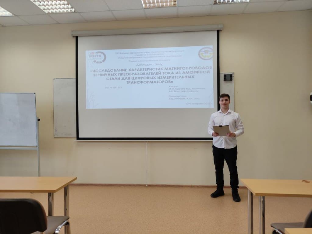 – магистрант 1-29М Александр Шустров с докладом: «Исследование характеристик магнитопроводов первичных преобразователей тока из аморфной стали для цифровых измерительных трансформаторов», авторы М.М. Бушуев, В.Д. Терентьев (студенты гр. 3-29), А.В. Шустров; рук. зав. каф. АУЭС, к.т.н., доц. В.Д. Лебедев;