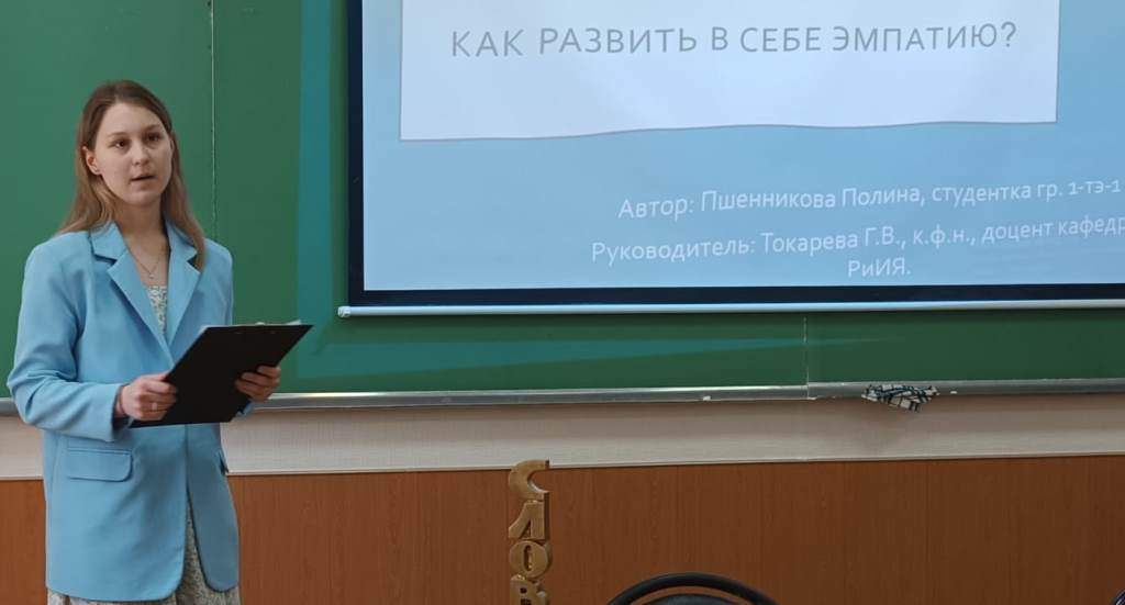 Полина Пшенникова (1-ТЭ-1) посвятила свое исследование такому важному вопросу, как необходимость развития эмпатии в современном обществе. Первокурсница обратила внимание присутствующих на тот факт, что данные массового опроса родителей  и преподавателей позволяют говорить о тенденции усиления неблагополучия в эмоциональной сфере нынешнего поколения, особенно молодежи,  в сравнении с предыдущим.  Молодые люди сегодня более склонны впадать в тревогу, более импульсивны и агрессивны, им в большей степени присущи чувства одиночества и подавленности. Ценными для слушателей стали рекомендации автора доклада по развитию в себе эмпатии – умения, необходимого для успешного межличностного и делового общения.