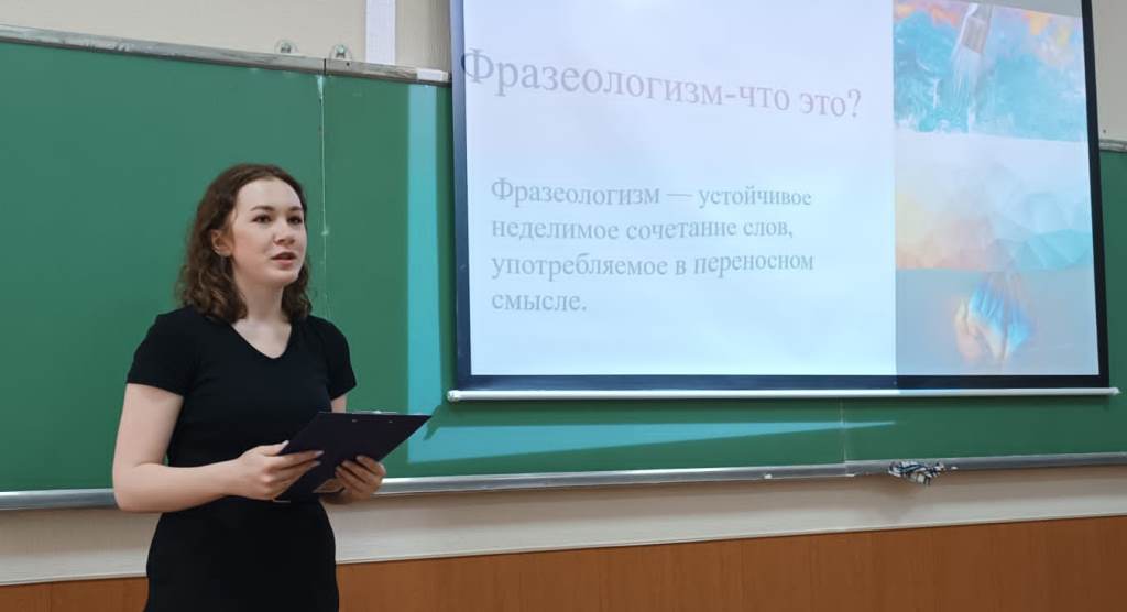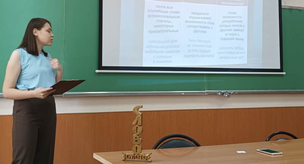 Александра Чупина (1-12а) обратила внимание студентов на важность соблюдения норм литературного языка, рассмотрев вопрос об особенностях лексической сочетаемости слов в современных контекстах.