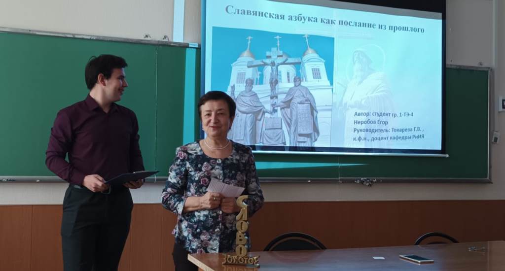 Егор Неробов (1-ТЭ-4) убеждал присутствующих в том, что славянская азбука является уникальным культурным феноменом, хранящим мистическое послание последующим поколениям от наших предков. В преддверии Дня славянской письменности и культуры данное выступление, несомненно, имело особую актуальность.