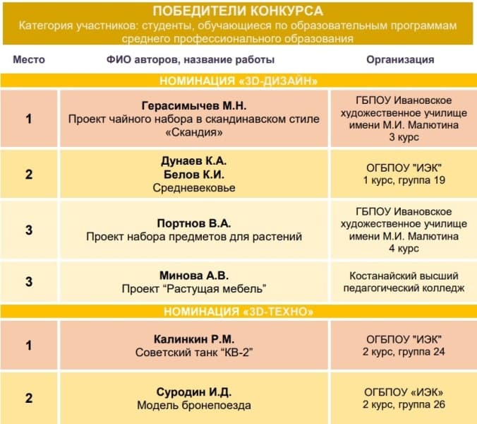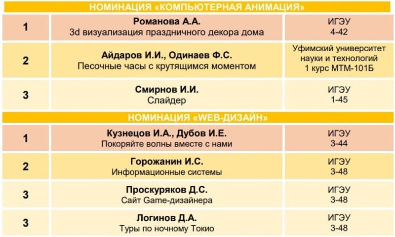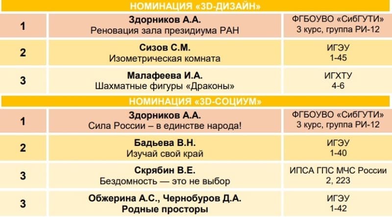 Конкурс проводился с 30 марта по 15 мая 2024 г. на базе Ивановского государственного энергетического университета по 5 номинациям: 1 номинация – 3D-Техно; 2 – 3D-Дизайн; 3 – 3D-Социум; 4 – Компьютерная анимация; 5 – Web-дизайн.