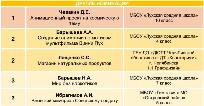 В Конкурсе участвовали 158 проектов, 163 участника из различных городов России и Казахстана: Иваново, Санкт-Петербург, Челябинск, Орёл, Белореченск, Лух, Новороссийск, Уфа, Южно-Курильск и др.