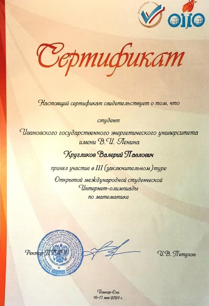 Валерий Кругликов (2-ЭЭ-5) стал участником III (заключительного) тура международной Открытой студенческой Интернет-олимпиады по математике.