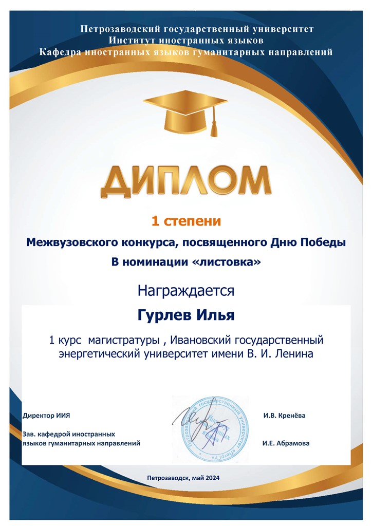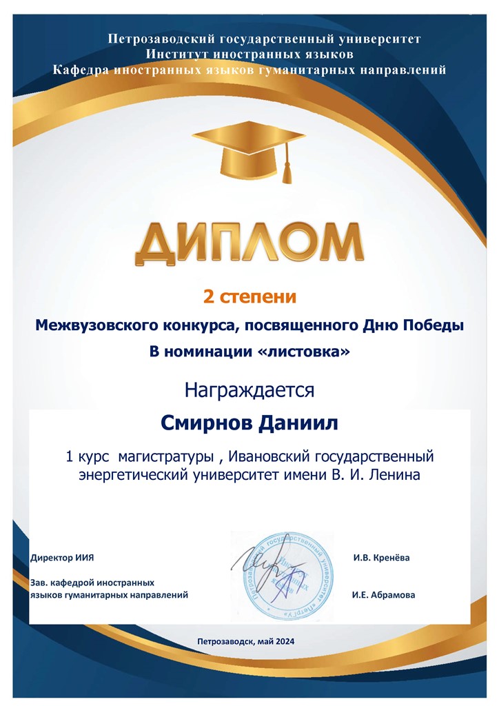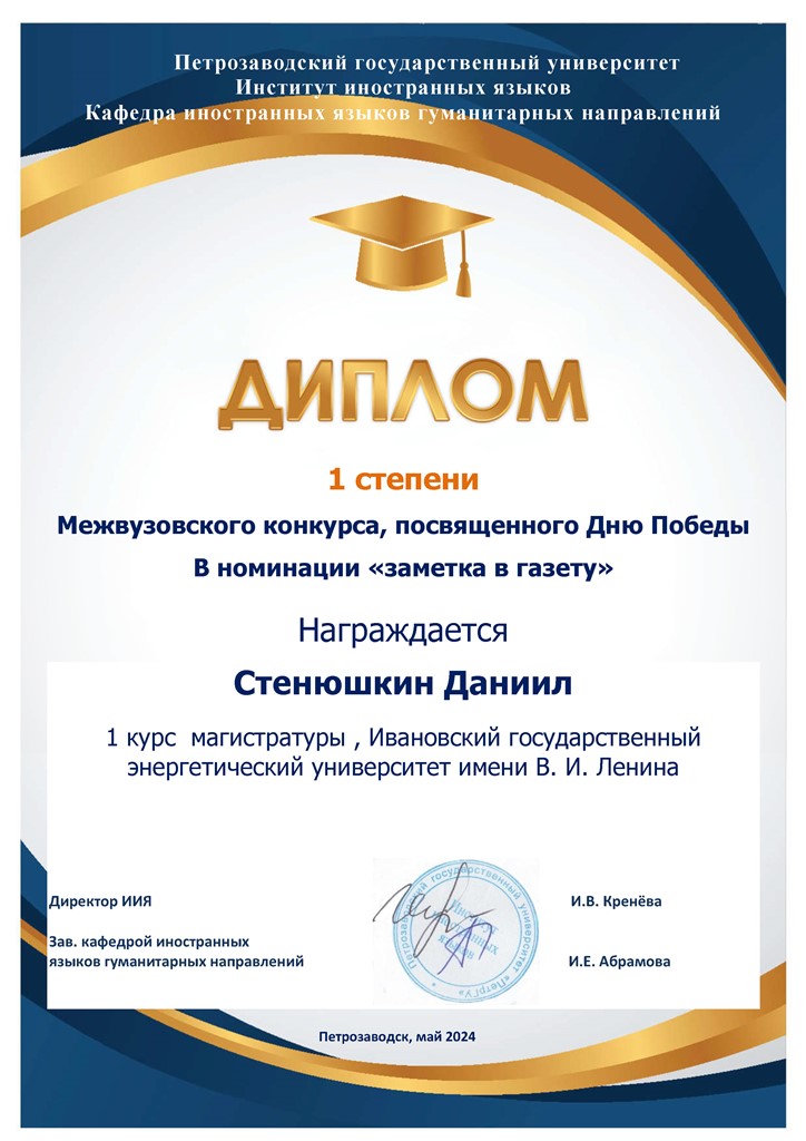 Студенты ИГЭУ приняли участие в межвузовском конкурсе, посвященном героической победе нашего народа в Великой отечественной войне. Конкурс организован Петрозаводским государственным университетом, г. Петрозаводск. В конкурсе участвовали более 180 работ студентов вузов России.