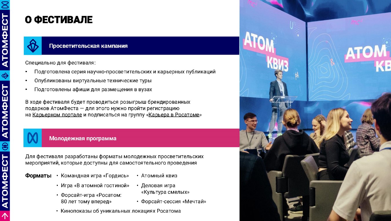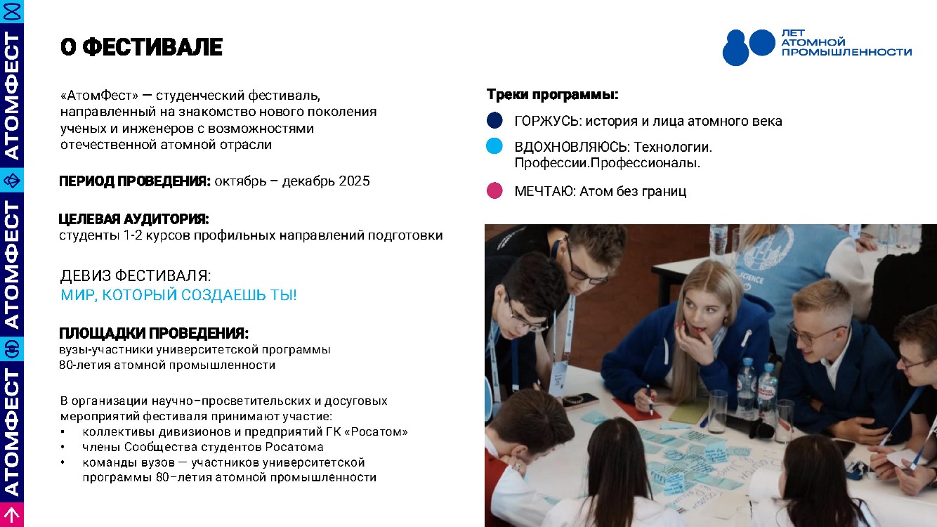Проведение «АтомФеста» приурочено к знаменательной дате — 80-летию атомной промышленности России. Это прекрасная возможность для нового поколения связать свое будущее с историей успеха отечественных технологий.