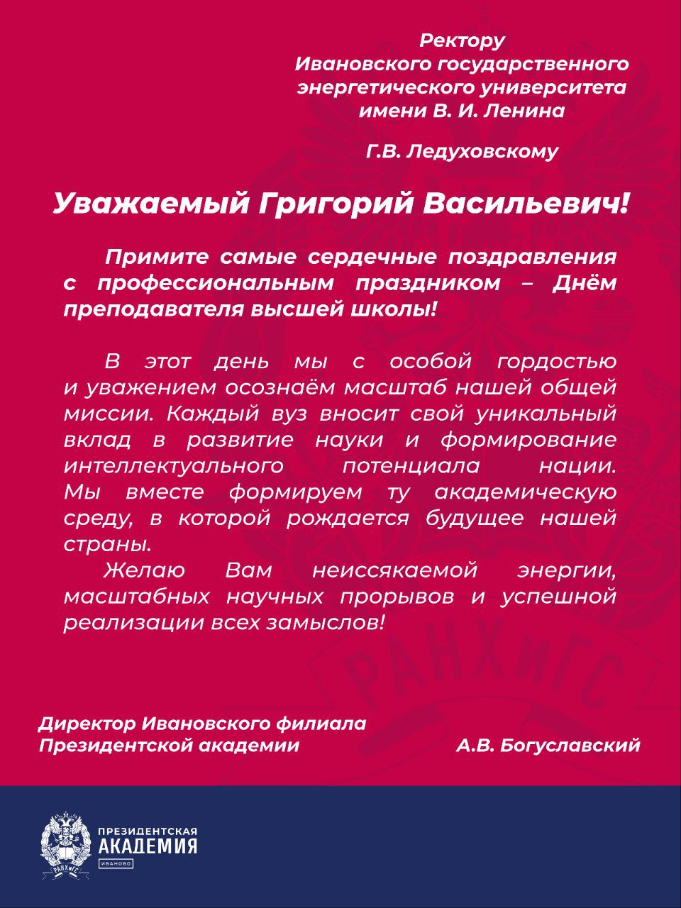 ПОЗДРАВЛЕНИЕ РЕКТОРА ИГЭУ ГРИГОРИЯ ВАСИЛЬЕВИЧА ЛЕДУХОВСКОГО