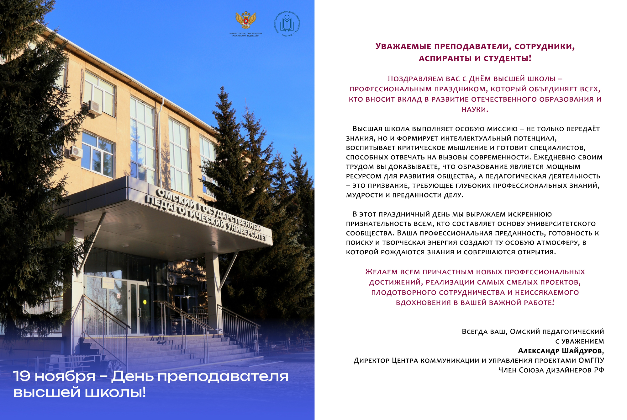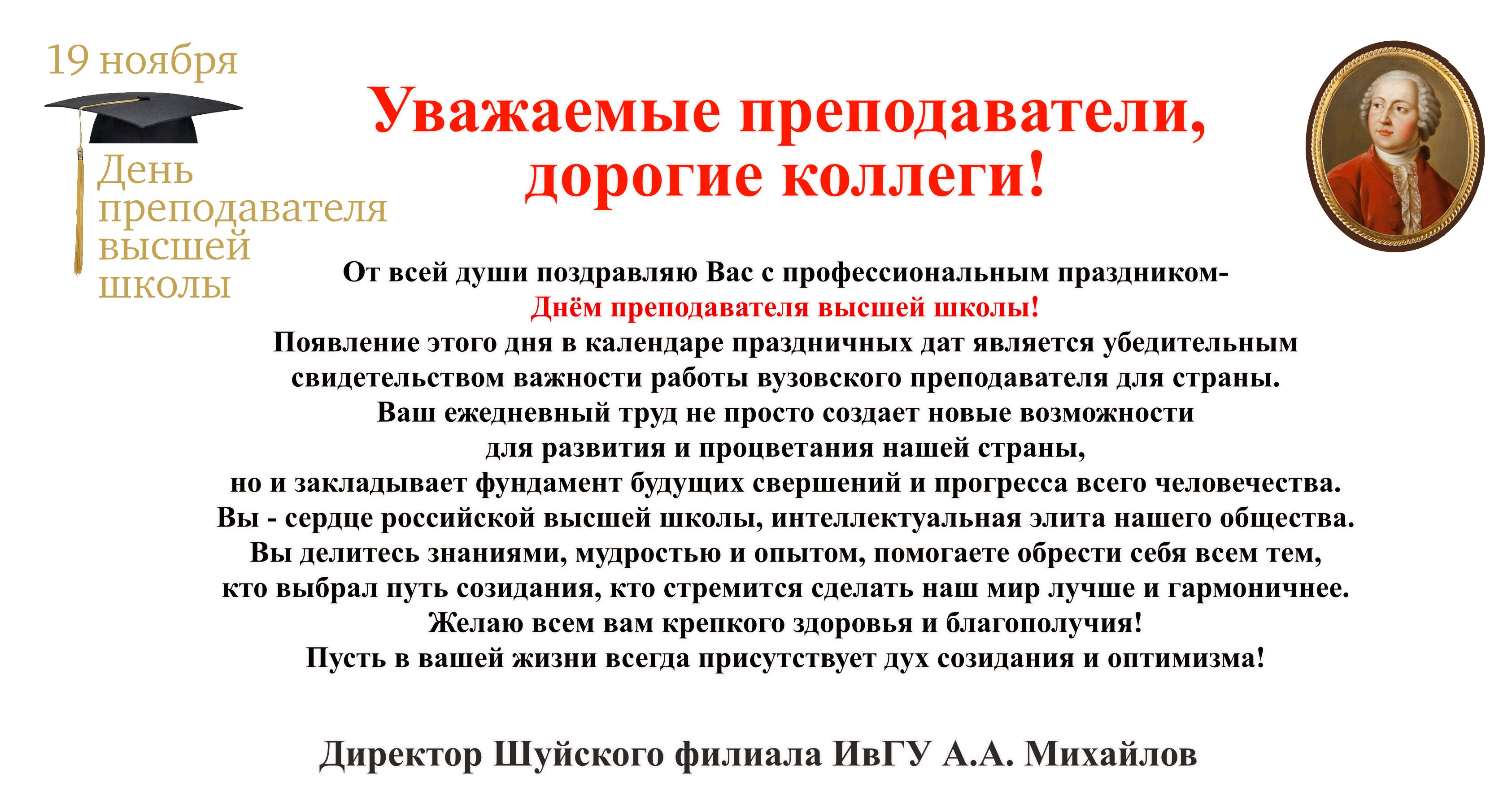 «Этот праздник – дань глубокого уважения к вашей благородной профессии, в которой многое зависит от личности педагога, его увлеченности избранным делом и самоотдачи, душевной щедрости и искренней заботы о судьбе воспитанников, готовности самому неустанно учиться и вдохновлять своим примером студентов и аспирантов. И конечно, значим ваш вклад в становление молодых людей, формирование у них ответственной гражданской позиции, стремления направлять свои таланты и энергию на благо Отечества.