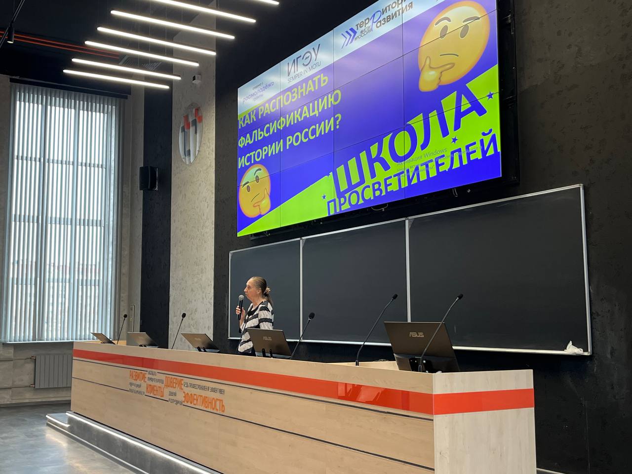 - Для студентов первых курсов были проведены интерактивные лекции и мастер-классы по способам выявления фальсификации отечественной истории. Студенты узнали о причинах искажения истории России внутренними и зарубежными акторами, о способах выявления фальсификации и борьбы с ней. Опытные эксперты Галина Анатольевна Будник и Алексей Сергеевич Сироткин провели ряд лекций по темам: «Как распознать фальсификацию истории России?»; «Великая Отечественная и Вторая мировая войны в контексте геополитических интересов западных стран»; «Специальная военная операция как симулякр западной антироссийской пропаганды». В мастер-классах студенты на практике освоили некоторые способы выявления фальсификации, а также получили опыт создания видеороликов и презентаций на соответствующую тематику.