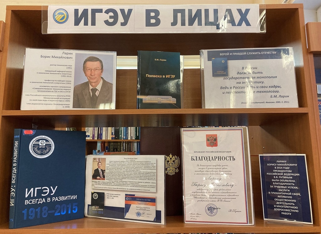 Творческая встреча, проходившая в рамках юбилейных торжеств к 95-летию университета, была совмещена с открытием выставки «ИГЭУ в лицах: Научная школа Б.М. Ларина». Выставка, состоящая из двух разделов, освещает деятельность профессора Б.М. Ларина и становление и развитие научного направления «Совершенствование технологии водного теплоносителя на ТЭС и АЭС». Впервые в Библиотеке на выставке демонстрируется прибор в рабочем режиме, разработка группы учёных под руководством Б.М. Ларина, и, пожалуй, самый интересный объект экспозиции - анализатор качества воды «Лидер-К».