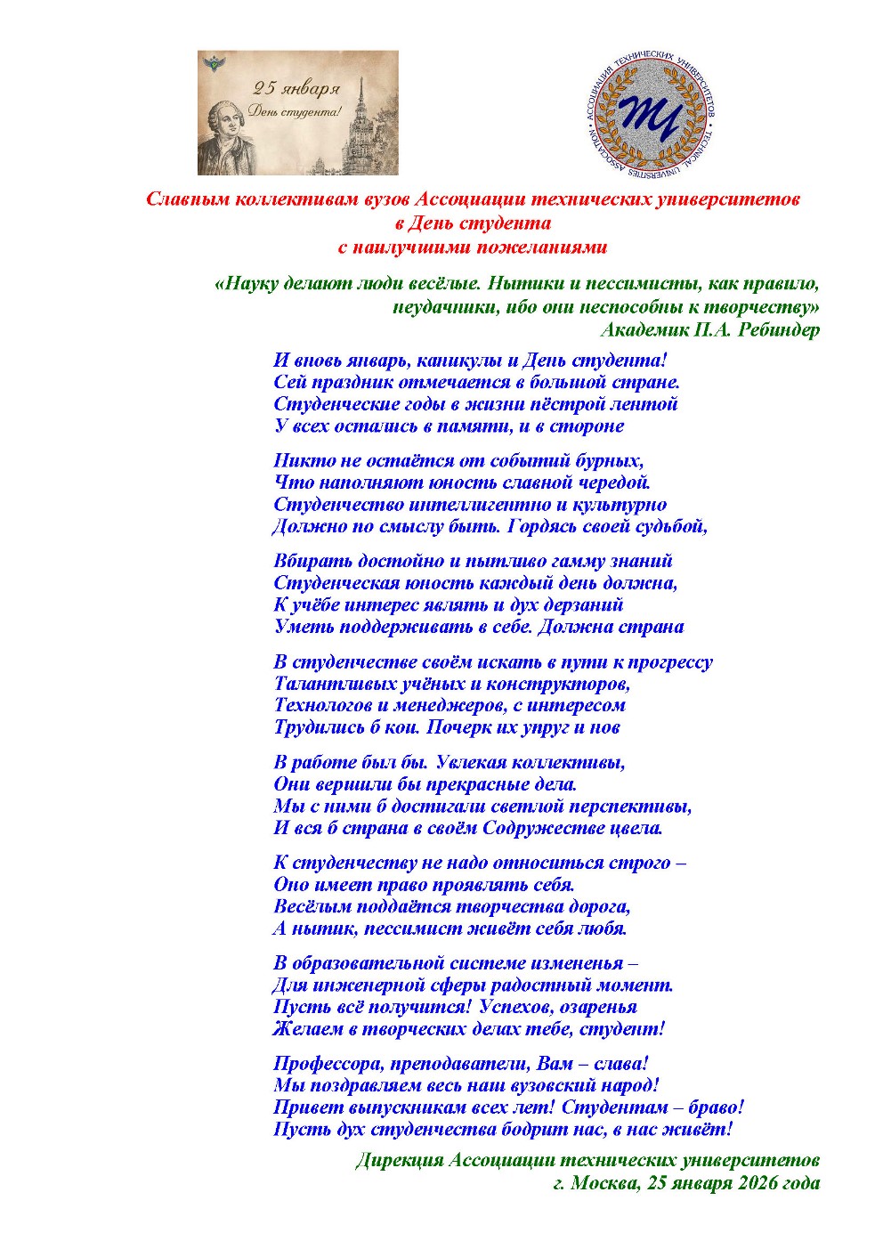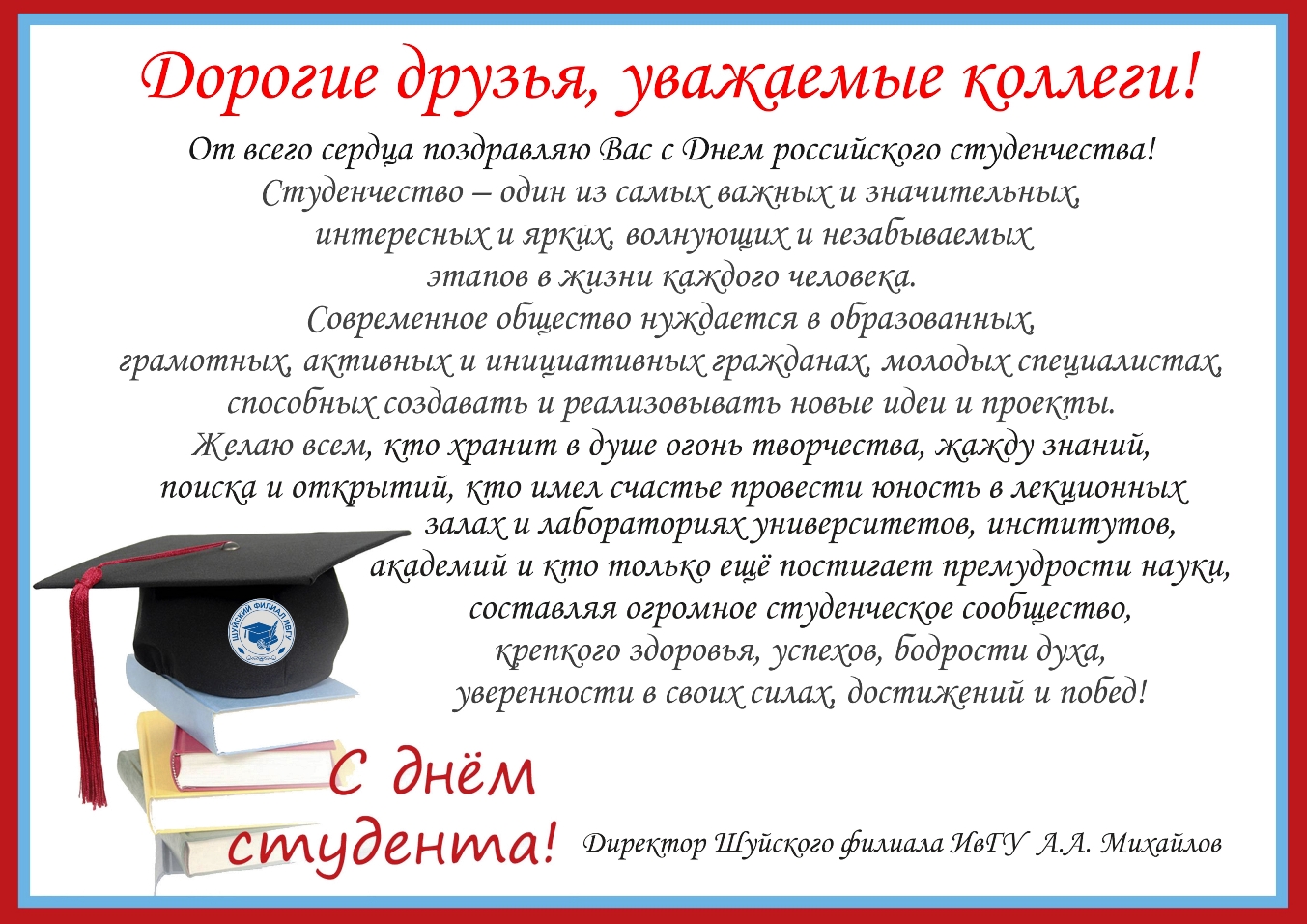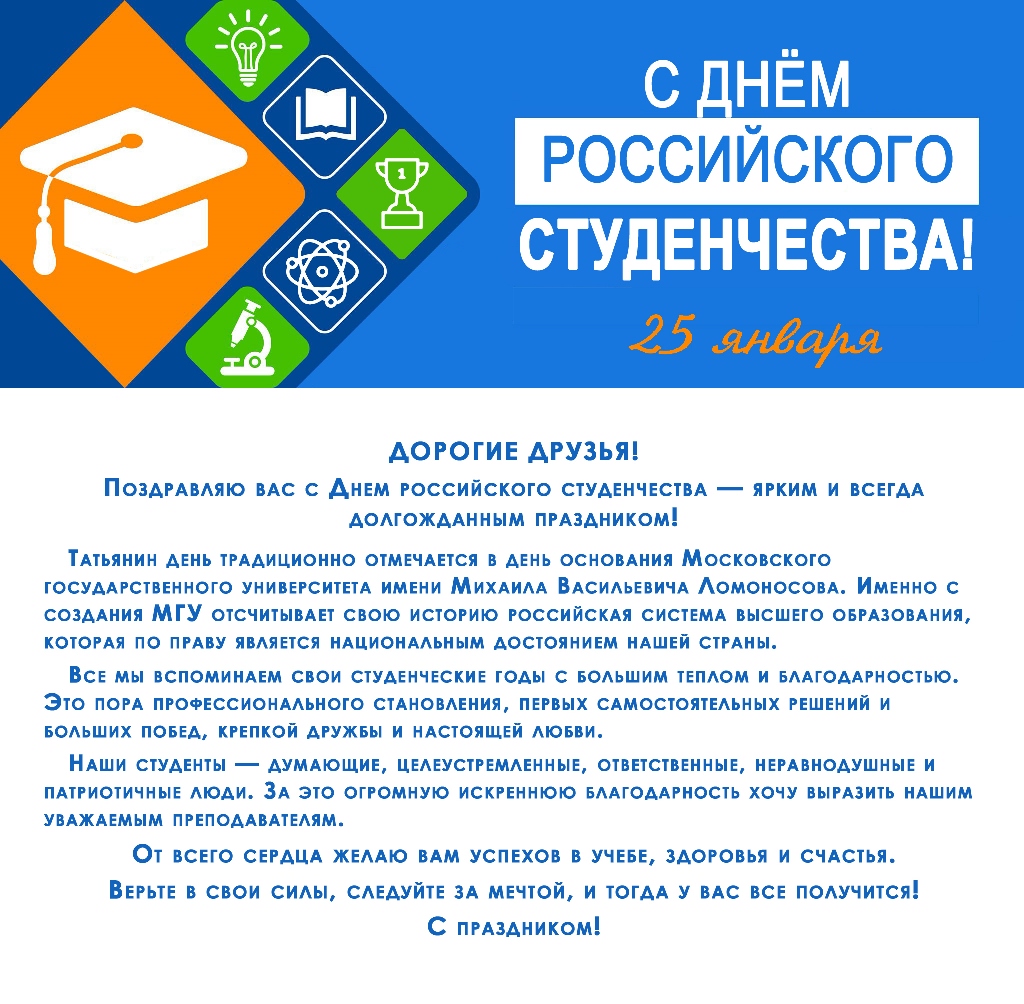 Дорогие студенты, от всей души поздравляем вас с Днем российского студенчества! Здоровья вам, успешной учебы, уверенности в своих силах и творческого вдохновения, достижений и побед! Пусть студенческие годы станут надёжной основой вашей жизни.