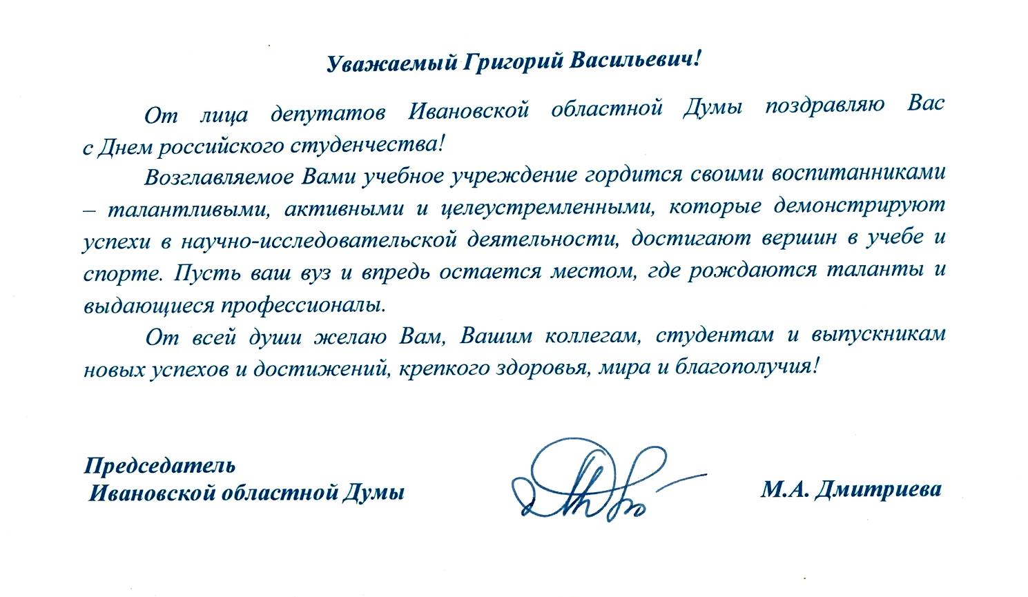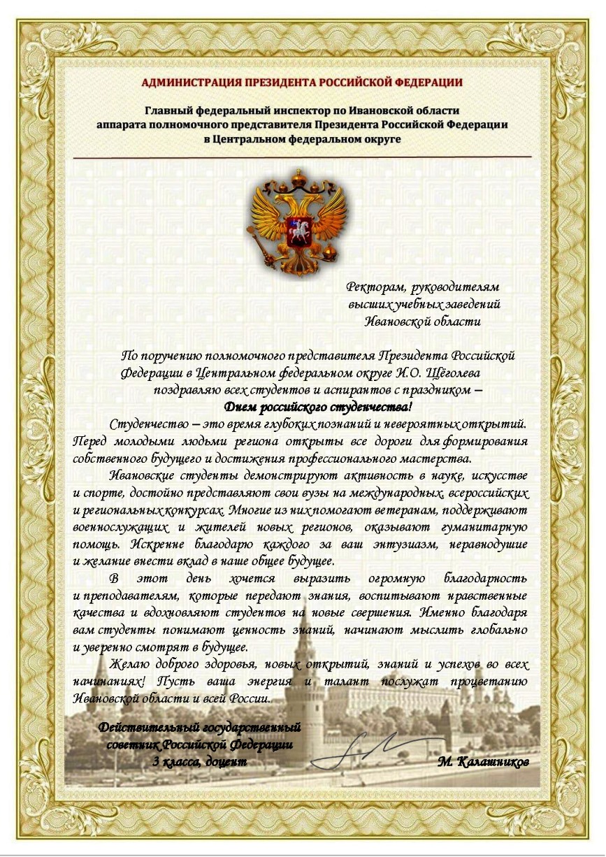 Коллектив Ивановского государственного энергетического университета поздравляет всех студентов с праздником! Пусть студенческие годы будут для вас счастливыми, насыщенными множеством запоминающихся ярких моментов, богатыми на достижения и победы! Перед вами открыты все дороги и широкие возможности. Воспользуйтесь ими максимально эффективно, ведь именно сейчас закладывается фундамент ваших будущих свершений! Удачи и успехов вам во всех начинаниях!