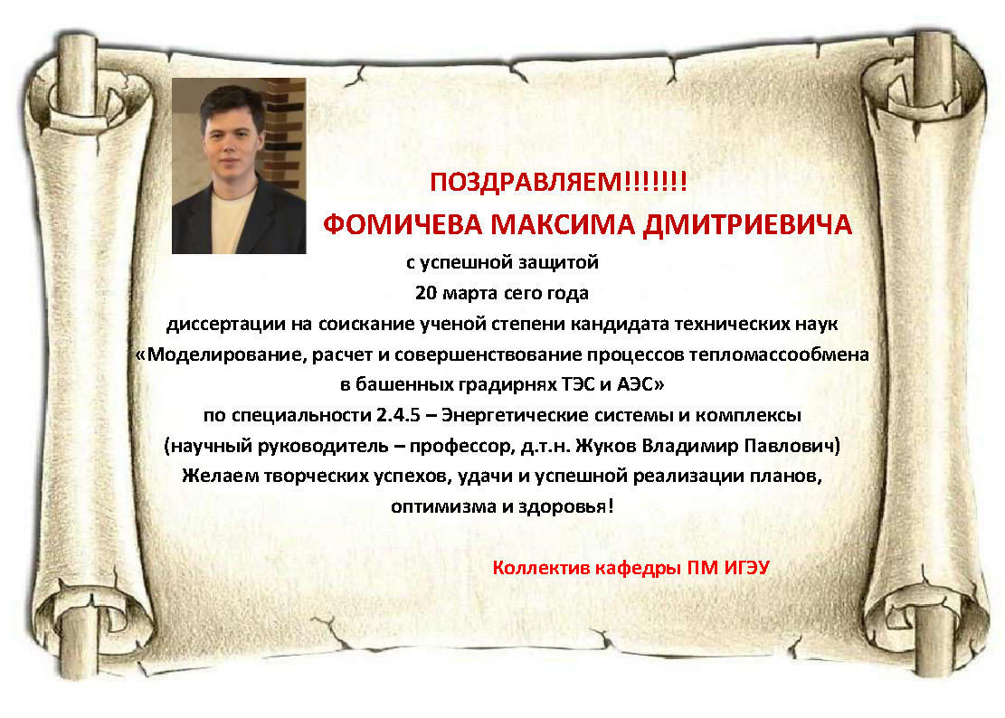 В диссертационном совете 24.2.303.01 при ИГЭУ состоялась защита кандидатской диссертации Фомичева Максима Дмитриевича на тему «Моделирование, расчет и совершенствование процессов тепломассообмена в башенных градирнях ТЭС и АЭС» по специальности 2.4.5 «Энергетические системы и комплексы».